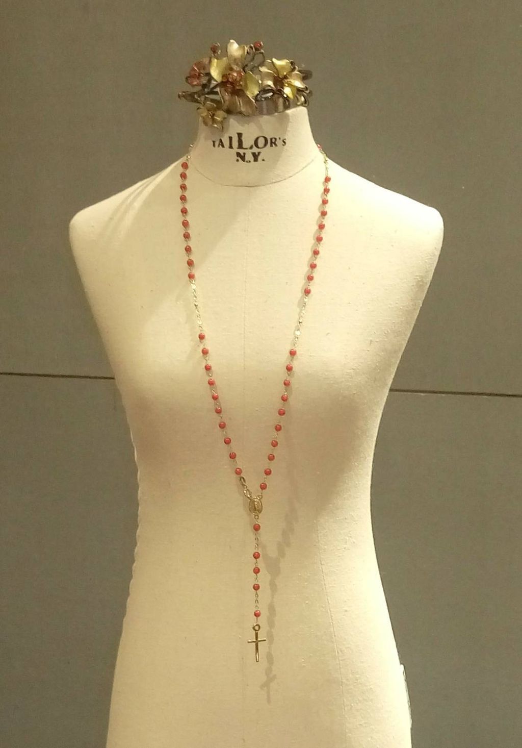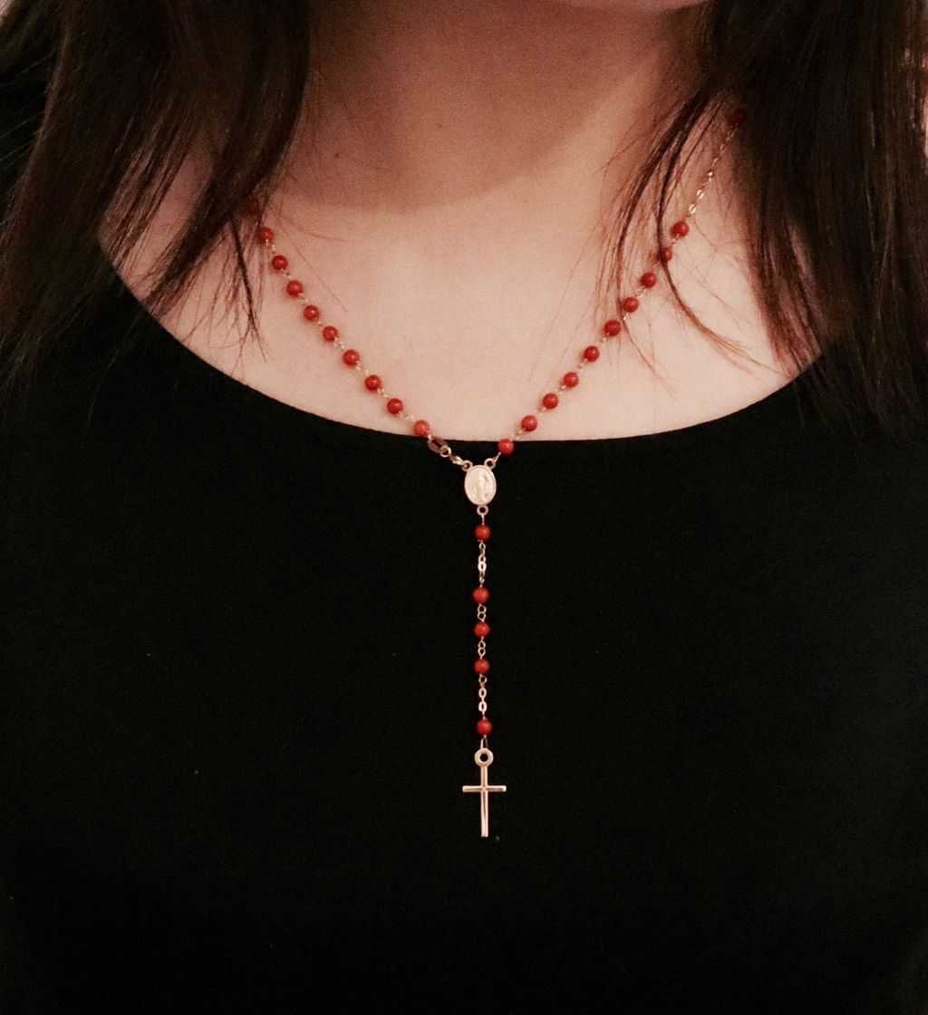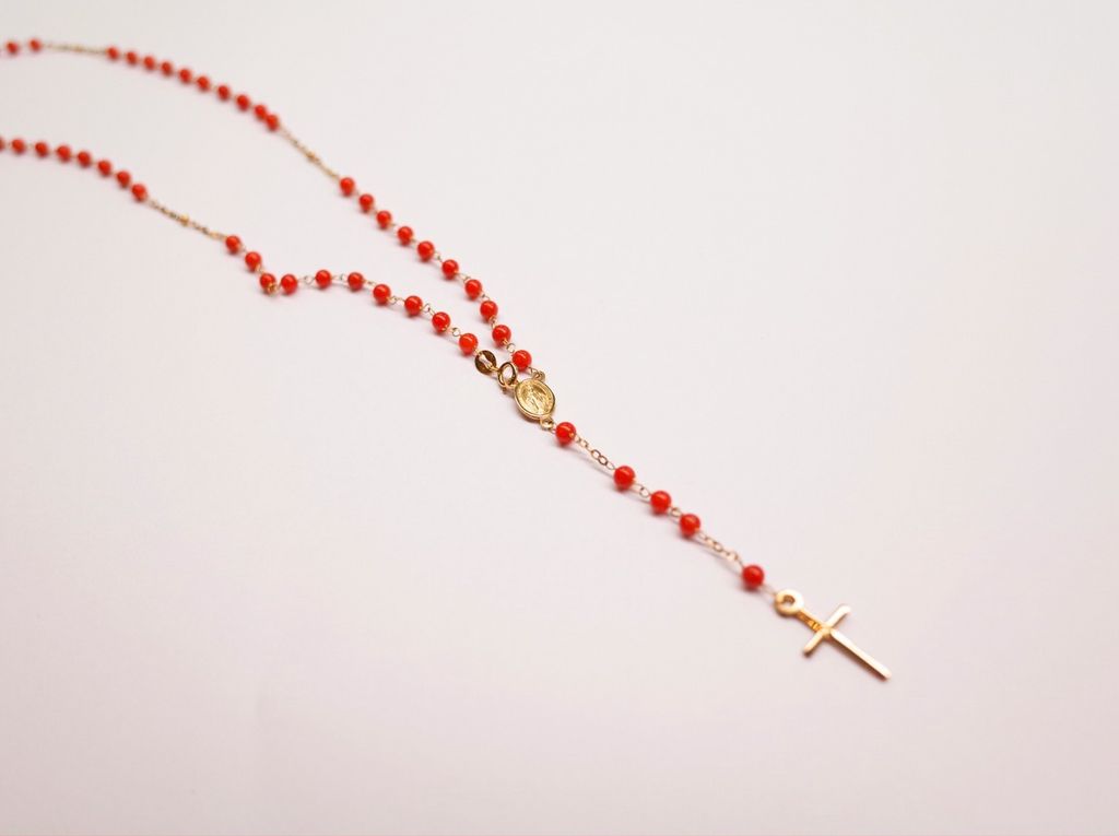 這款18k金的古典的十字架項鍊,以一顆顆橘紅色的珊瑚,